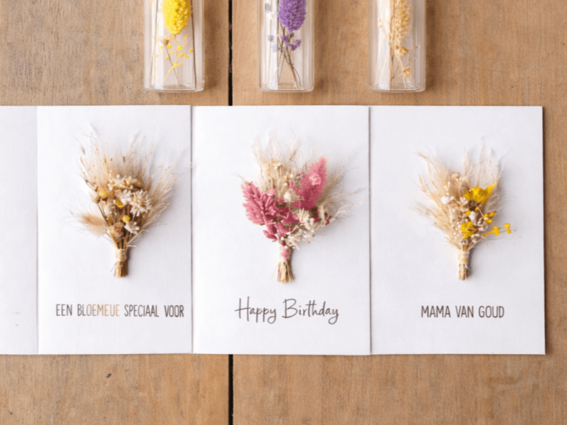 Op zondag krijg je de kans om 3 wenskaartjes & 3 wensflesjes te maken. Je kan ze zelf personaliseren met de keuze van je droogbloemen. En er is keuze genoeg!